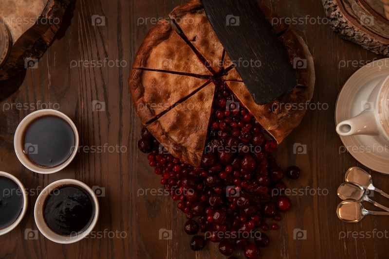Ягодный пирог со свежими ягодами и вареньем на старинном деревянном фоне. Вид сверху