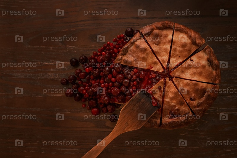 Ягодный пирог со свежими ягодами и вареньем на старинном деревянном фоне. Вид сверху