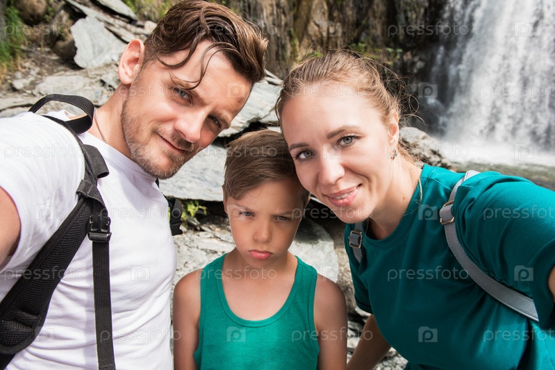 Селфи семьи в горах, на фоне водопада. Счастливые родители и несчастный ребенок. Концепция путешествия