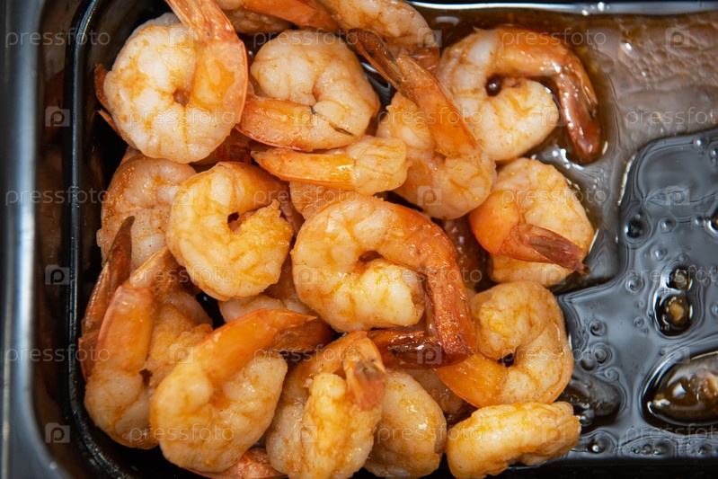Маринованные креветки в черном пластиковом контейнере крупным планом