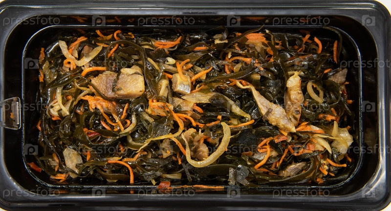 Салат из водорослей чука вакаме ламинария с рыбой в пластиковых мисках. Концепция производства здоровой пищи или доставки еды