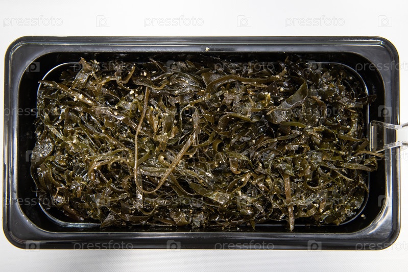 Салат из водорослей чука вакаме ламинария в пластиковых мисках. Концепция производства здоровой пищи или доставки еды
