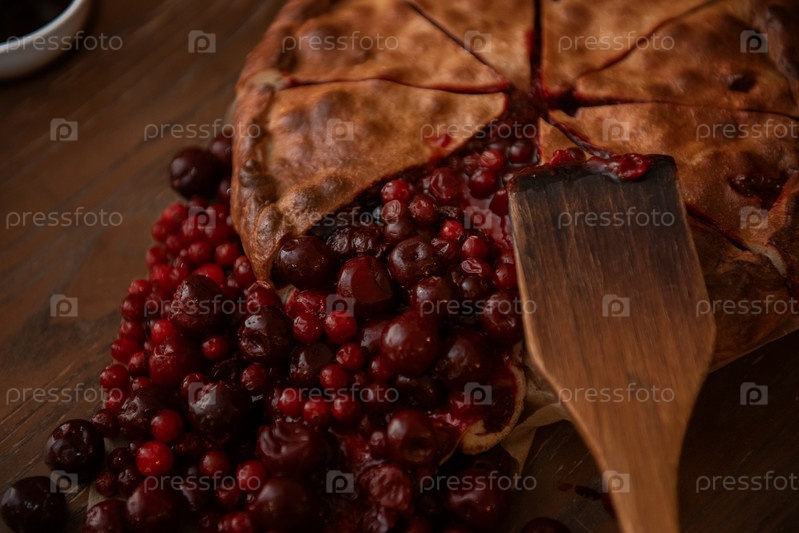 Ягодный пирог со свежими ягодами и вареньем на старинном деревянном фоне. Вид сверху
