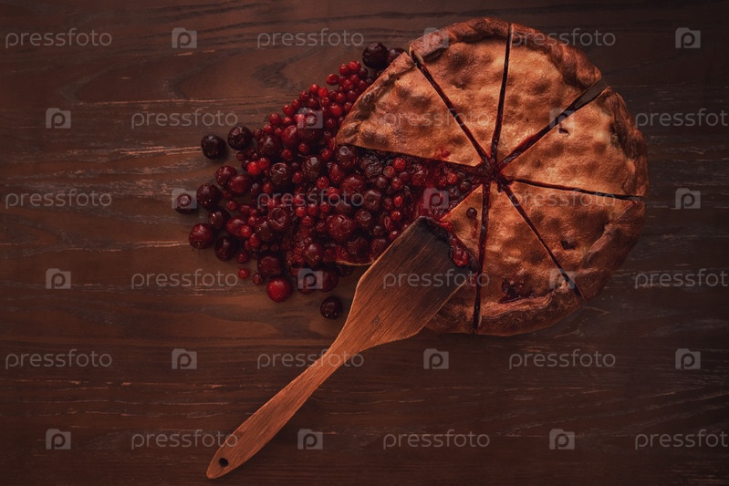 Ягодный пирог со свежими ягодами и вареньем на старинном деревянном фоне. Вид сверху