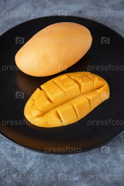 Свежие желтые плоды манго на черной тарелке на сером каменном фоне