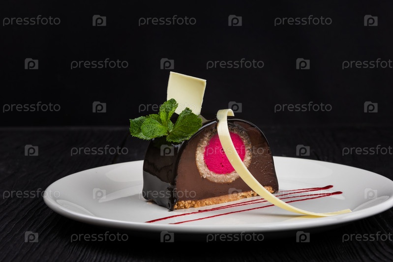 Вкусный бисквитный шоколадный торт крупным планом с розовым суфле, украшенный мятой и белым шоколадом на темном фоне