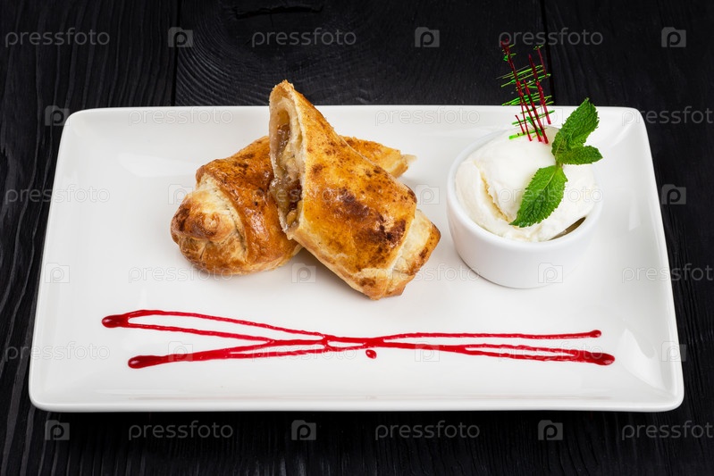 Яблочный штрудель с ванильным мороженым, украшенный карамелью и ягодным соусом