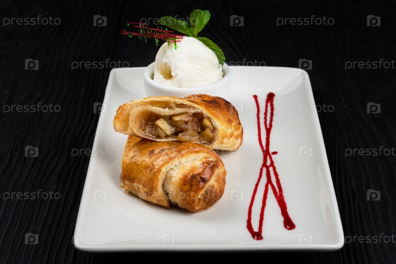 Яблочный штрудель с ванильным мороженым, украшенный карамелью и ягодным соусом