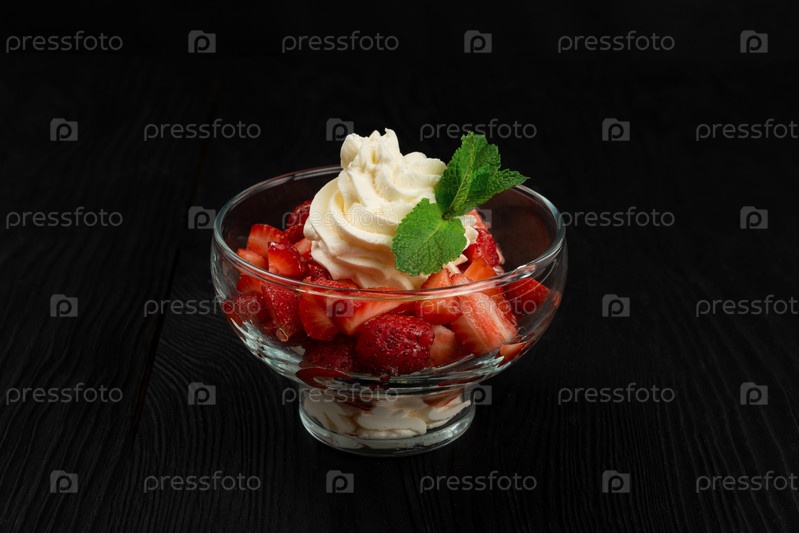 Клубника со сливками, украшенная листочком мяты на черном деревянном фоне, концепция еды и напитков