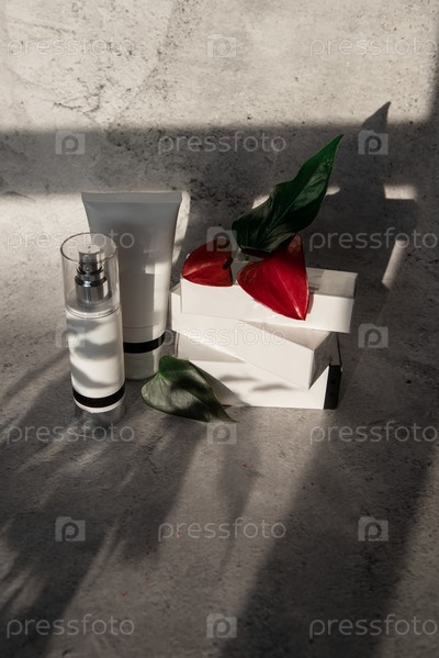 Косметические бутлы с цветами на сером фоне