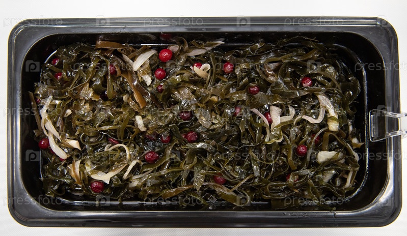 Салат из водорослей чука вакаме ламинария с ягодами в пластиковых мисках. Концепция производства здоровой пищи или доставки еды