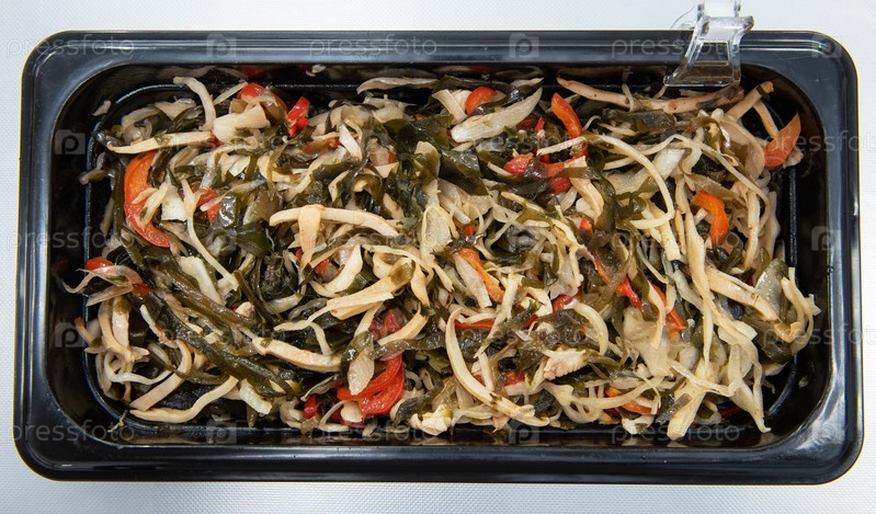 Салат из водорослей чука вакаме ламинария с кальмарами в пластиковых мисках. Концепция производства здоровой пищи или доставки еды