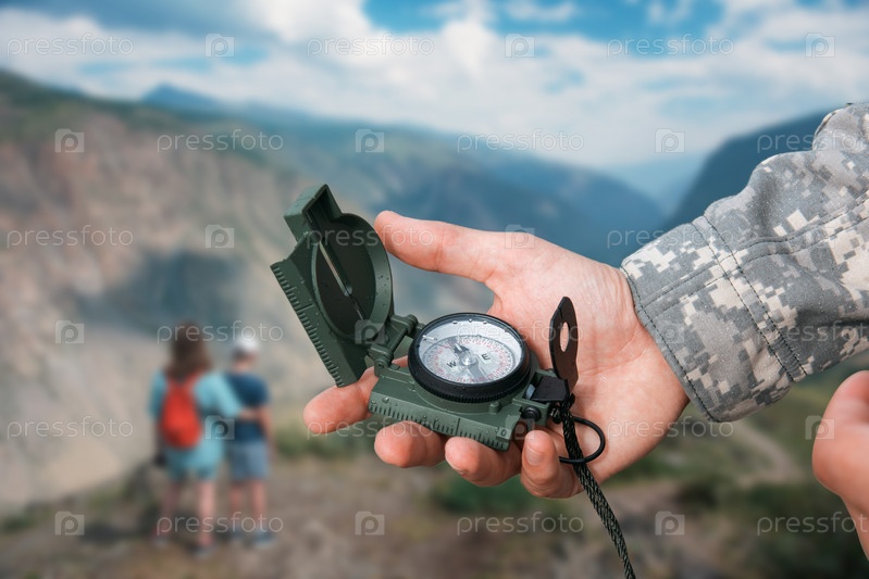 Человек с компасом в руке в горах Алтая. Концепция путешествия. Компас