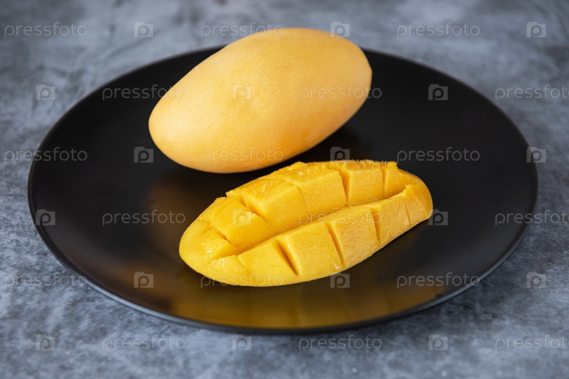 Свежие желтые плоды манго на черной тарелке на сером каменном фоне
