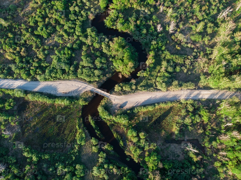Аэрофотоснимок летнего июньского пейзажа с рекой с помощью дрона