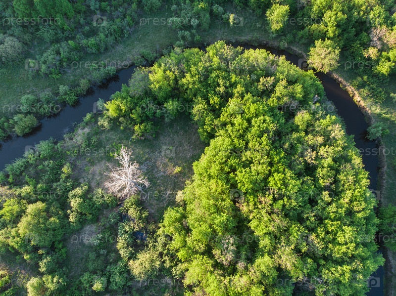 Аэрофотоснимок летнего июньского пейзажа с рекой с помощью дрона