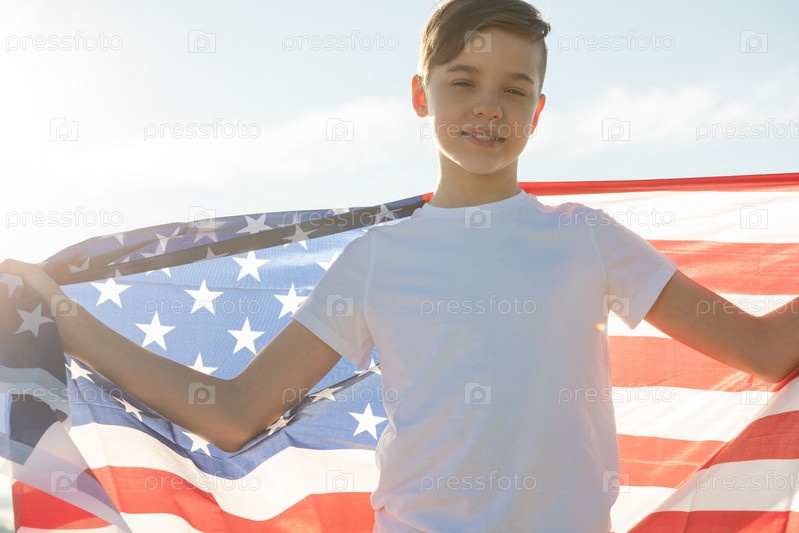 Белокурый мальчик машет национальным флагом США на открытом воздухе над голубым небом на берегу реки. Красота летнего солнечного дня. Американский флаг, патриотизм, день независимости 4 июля концепция