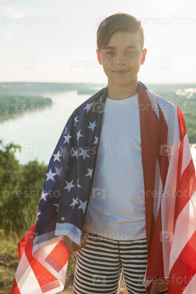 Белокурый мальчик машет национальным флагом США на открытом воздухе над голубым небом на берегу реки. Красота летнего солнечного дня. Американский флаг, патриотизм, день независимости 4 июля концепция