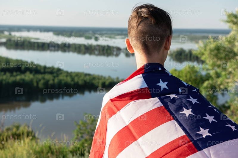Белокурый мальчик машет национальным флагом США на открытом воздухе над голубым небом на берегу реки. Красота летнего солнечного дня. Американский флаг, патриотизм, день независимости 4 июля концепция