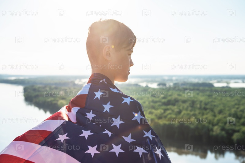 Белокурый мальчик машет национальным флагом США на открытом воздухе над голубым небом на берегу реки. Красота летнего солнечного дня. Американский флаг, патриотизм, день независимости 4 июля концепция