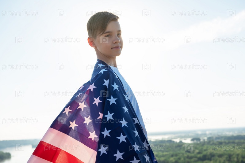 Белокурый мальчик машет национальным флагом США на открытом воздухе над голубым небом на берегу реки. Красота летнего солнечного дня. Американский флаг, патриотизм, день независимости 4 июля концепция