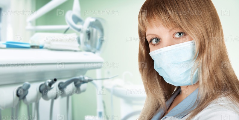 Женщина-стоматолог в защитной маске и белом халате