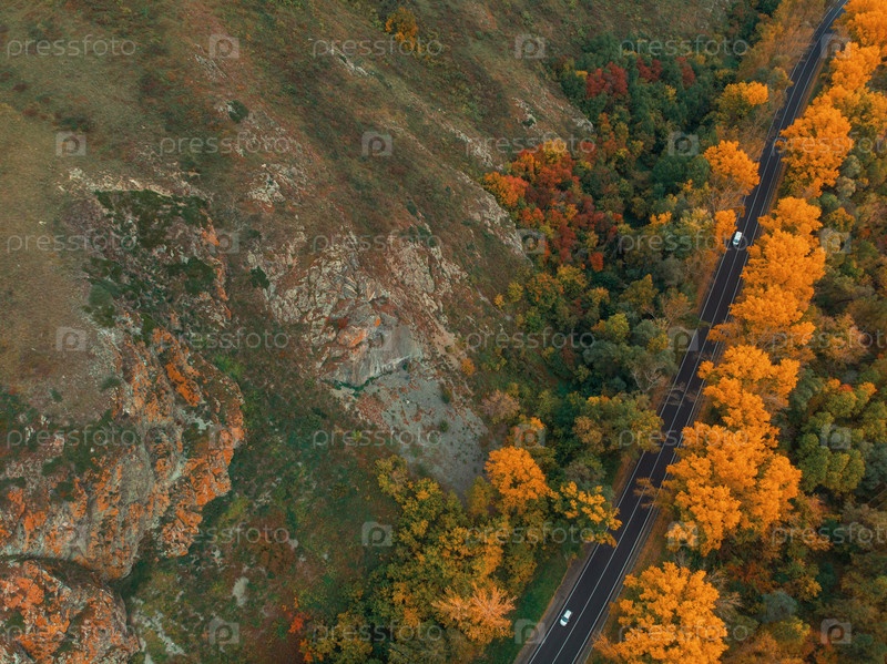 Вид с воздуха на дорогу в красивом осеннем лесу Алтая. Красивый пейзаж с пустой сельской дорогой, золотая осень на Алтае: деревья с красными, желтыми и оранжевыми листьями