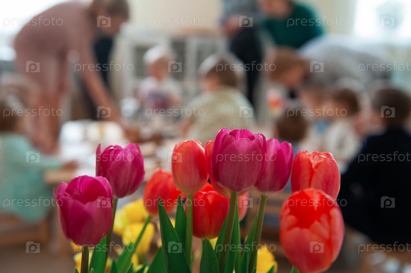 Концепция весеннего праздника, женского дня или дня матери в школе Монтессори для обучения детей
