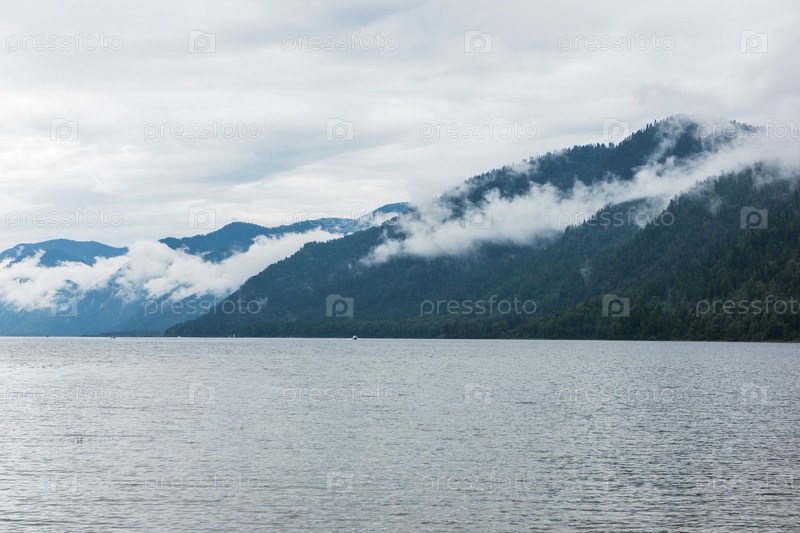 Телецкое озеро в горах Алтая, Сибирь, Россия. Туманное летнее утро