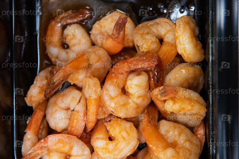 Маринованные креветки в черном пластиковом контейнере крупным планом