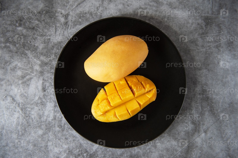 Свежие желтые плоды манго на черной тарелке на сером каменном фоне