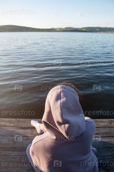 Молодая красивая женщина сидит на пирсе