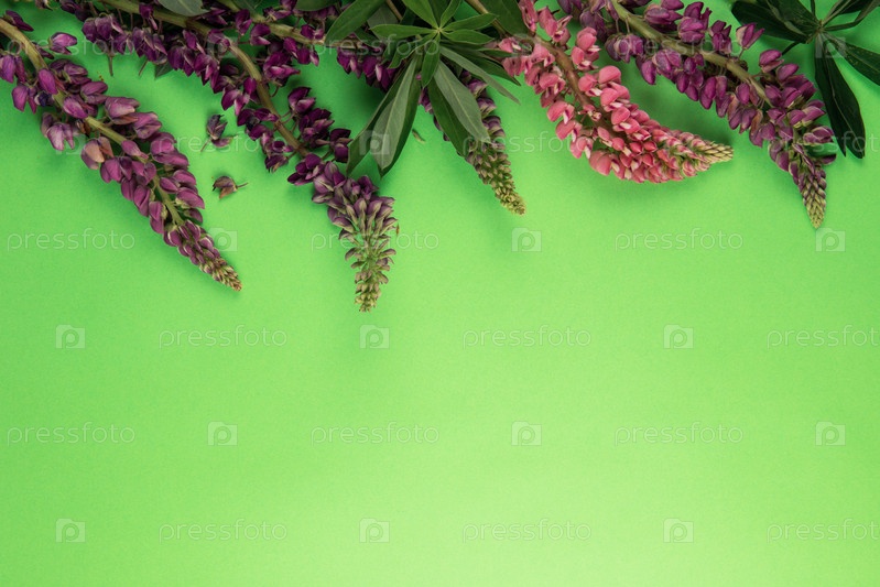 Макет текста на зеленой бумаге с декором из цветка люпина