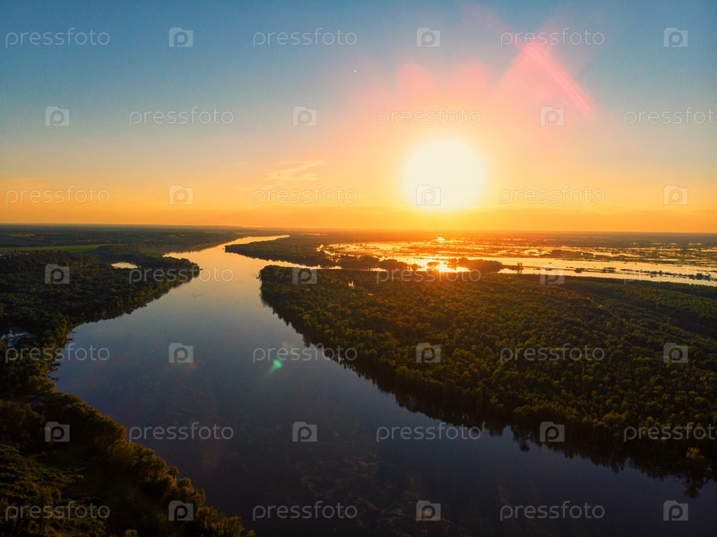 Воздушный вид с дрона на речной пейзаж в солнечный летний вечер. Вид сверху на сибирскую реку Обь с высоты в летний закат. Панорама, вид с высоты птичьего полета