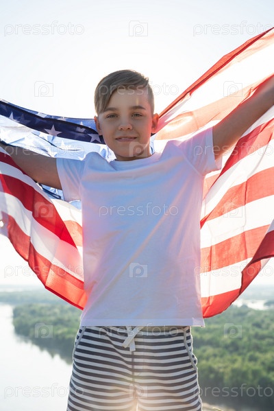 Белокурый мальчик машет национальным флагом США на открытом воздухе над голубым небом на берегу реки. Красота летнего солнечного дня. Американский флаг, патриотизм, день независимости 4 июля концепция