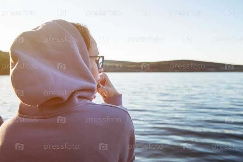 Молодая красивая женщина сидит на пирсе с копировальным пространством, летний закат