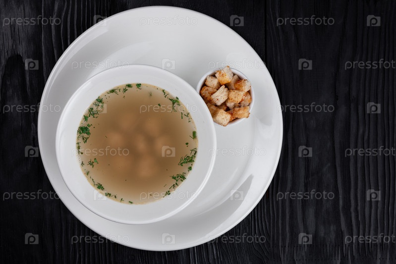 Куриный бульон в тарелке с куриными фрикадельками и гренками