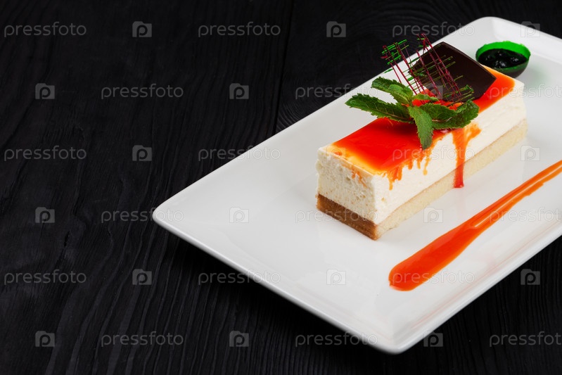 Чизкейк с соусом, карамелью, шоколадом и мятой