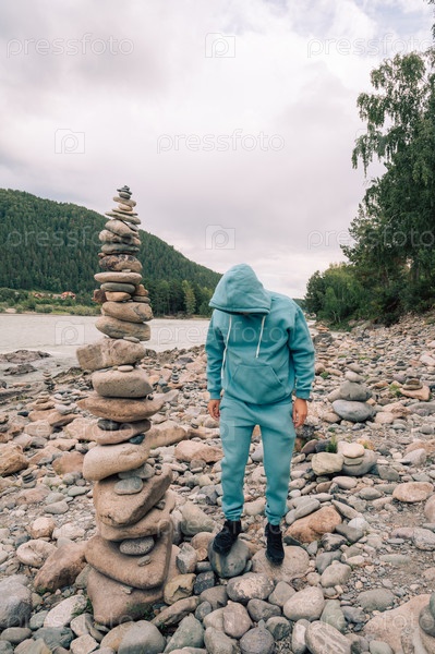 Мужчина у реки Катунь в летний день. Поездка в Алтайские горы в Республике Алтай