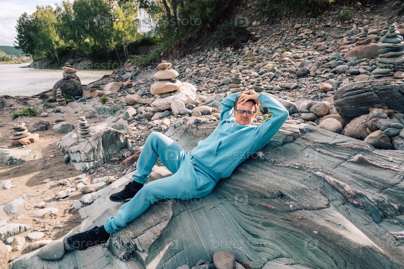 Мужчина у реки Катунь в летний день. Поездка в Алтайские горы в Республике Алтай