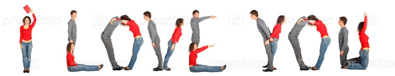 Мужчины и женщины составляют фразу I LOVE YOU, коллаж