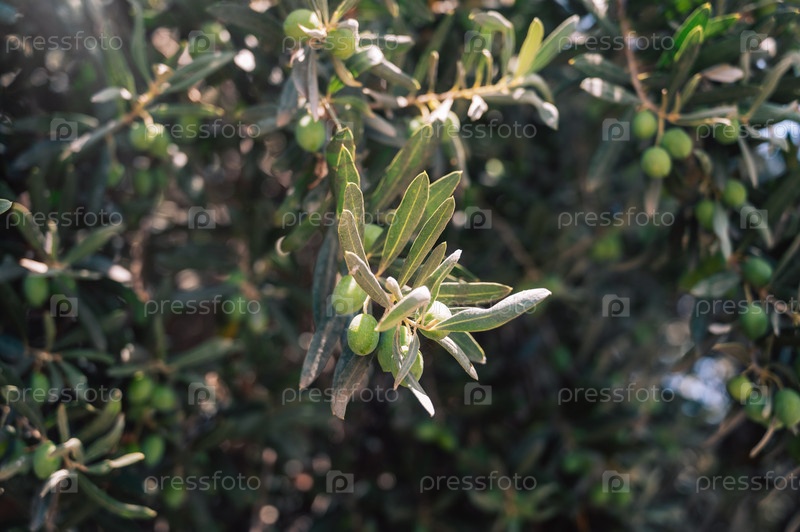 Зеленые оливки, растущие на оливковом дереве, на средиземноморской плантации, красота летнего дня