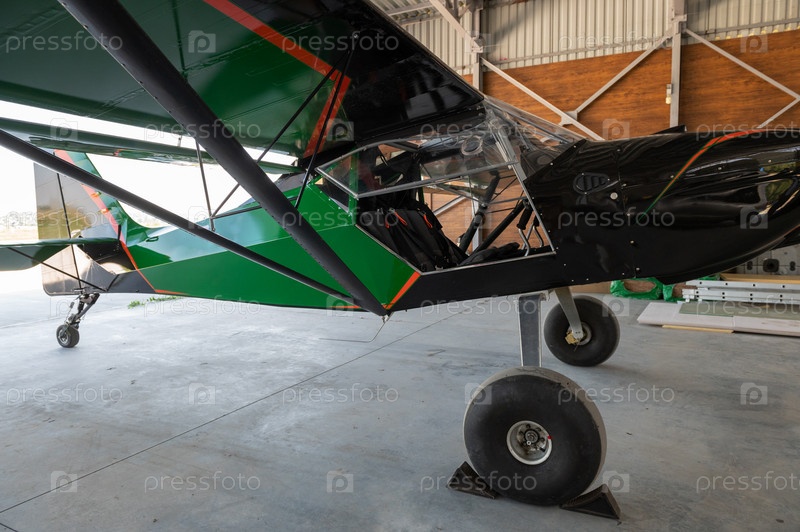 Маленький частный легкий винтовой самолет в ангаре, фотография крупным планом