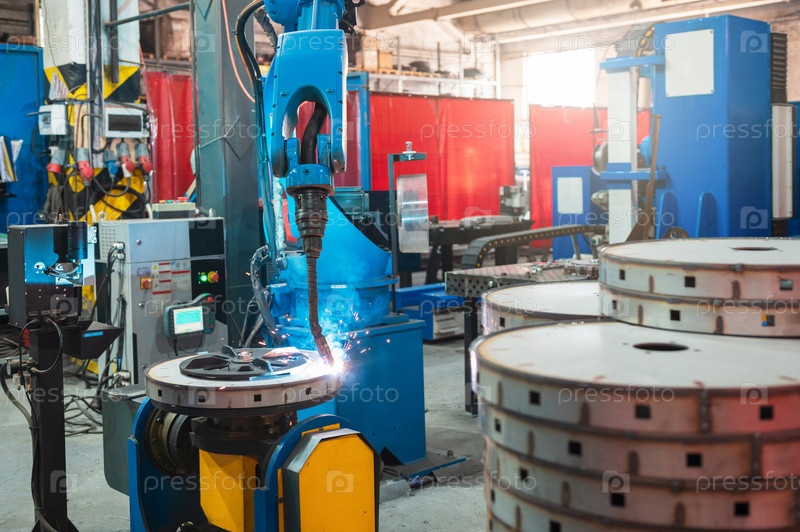 Автоматический промышленный сварочный робот на современном заводе в эксплуатации