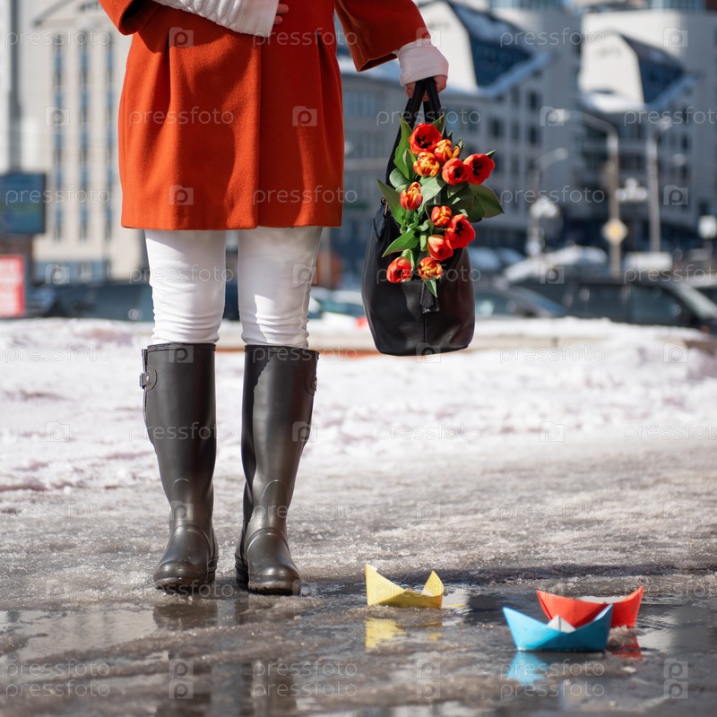 Крупный план женщины в оранжевом пальто и резиновых сапогах, идущей по улице с букетом тюльпанов