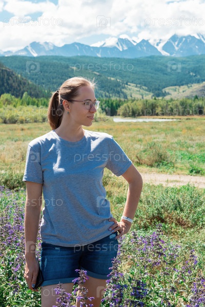 Счастливая молодая женщина в красивом поле диких розовых и фиолетовых цветов в летних горах Алтая