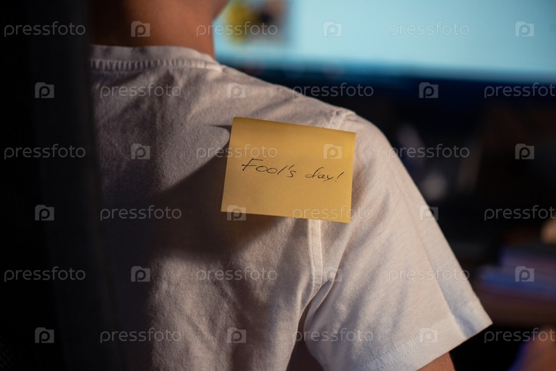 Наклеивание наклейки «День смеха» на плечо мальчика, занятого работой на компьютере — концепция празднования Дня смеха