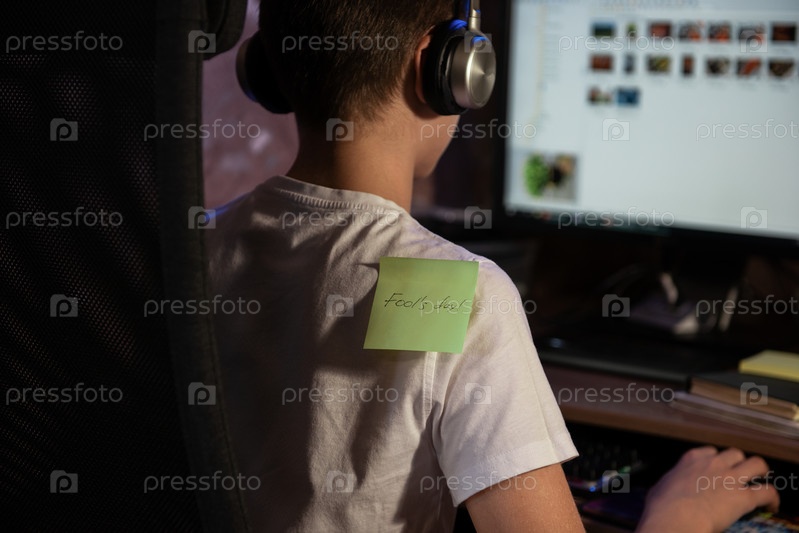 Наклеивание наклейки «День смеха» на плечо мальчика, занятого работой на компьютере — концепция празднования Дня смеха