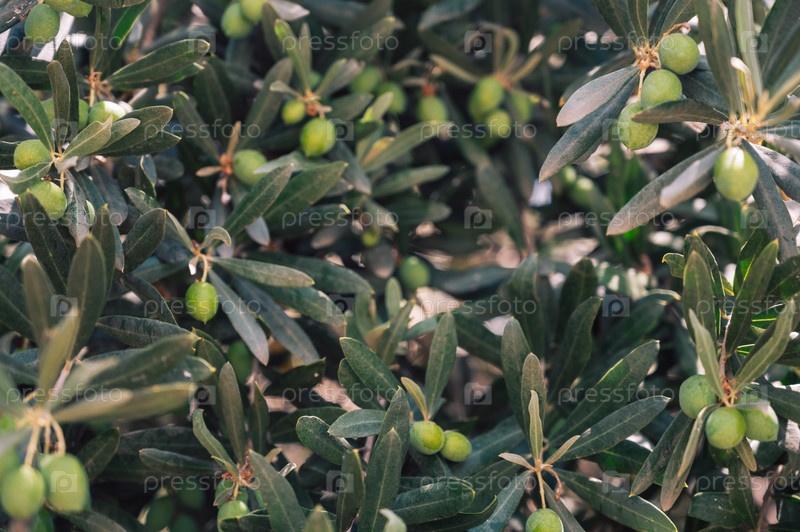 Зеленые оливки, растущие на оливковом дереве, на средиземноморской плантации,