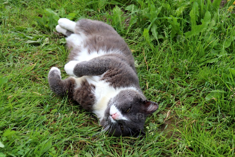 Серый кот лежит на спине и боку на зеленой траве в саду